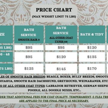 Your dog deserves to be pampered with luxurious & effective products without pesky "add-on" costs on a regular basis. Do they have special skin or coat needs? Would you like nail buffing & teeth brushing? No matter their needs & your wants, it's all included! Optional nail painting, bows, & bowties also available! (Pricing is based on your dog's coat type & size/weight: Small, Medium, Large (75 pound max weight limit.))
